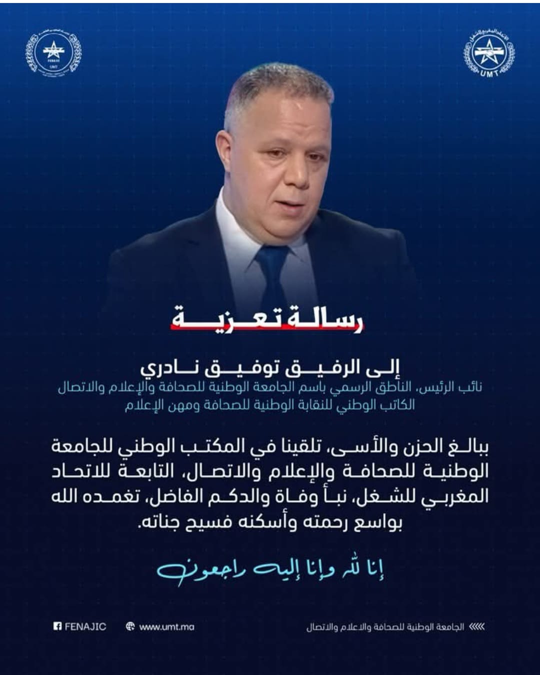 وبهذه المناسبة الأليمة نتقدم بأحر التعازي لرفيقنا توفيق الناطق الرسمي باسم الجامعة الوطنية للصحافة والإعلام والاتصال، راجين له ولأسرته الصبر الجميل وللفقيد الرحمة والمغفرة ومتواه في جنات النعيم.