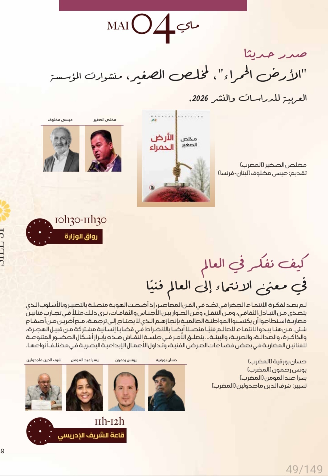 يقدم الشاعر والمفكر اللبناني عيسى مخلوف ديوان « الأرض الحمراء » للشاعر المغربي مخلص الصغير، يوم الإثنين 4 ماي الجاري، ابتداء من العاشرة والنصف صباحا، برواق وزارة الثقافة، ضمن فعاليات البرنامج الثقافي
